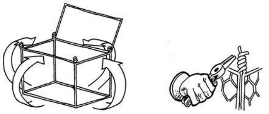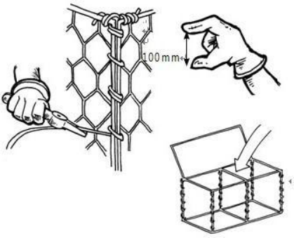 2、把每個旁邊面立起來,組合成一個網(wǎng)箱狀。網(wǎng)箱的每一個外表都有較粗的邊絲,在網(wǎng)面的邊角把這些重合的粗邊絲相互擰在一起。這些擰在一起的邊絲在邊角和綁絲重合。